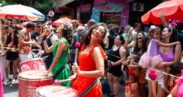 Diferente do formato tradicional, em que o público acompanha o trio em deslocamento, As Charangueiras fazem um desfile “parado”, pensado para acolher quem quer curtir a folia com mais conforto e segurança. Com foco em toda a família, o bloco reúne um público que vai das crianças aos avós, incluindo pessoas com mobilidade reduzida, e transforma a rua em uma festa democrática e para todos. “A gente recebe muita criança e pensa em cada detalhe para que elas possam aproveitar junto com os responsáveis, sem aperto e sem correria. O bloco parado vira um encontro: dá para dançar, cantar, brincar e ver de perto a bateria. E pensamos também naqueles que têm dificuldade de locomoção, que podem curtir a festa tranquilamente”, explica Ana Andrade, fundadora e diretora do bloco. Para completar o clima lúdico, personagens icônicos também entram na folia, com a presença de Moana, Elsa (Frozen) e outras “princesas” que fazem a alegria da criançada durante a manhã de pré-carnaval.
